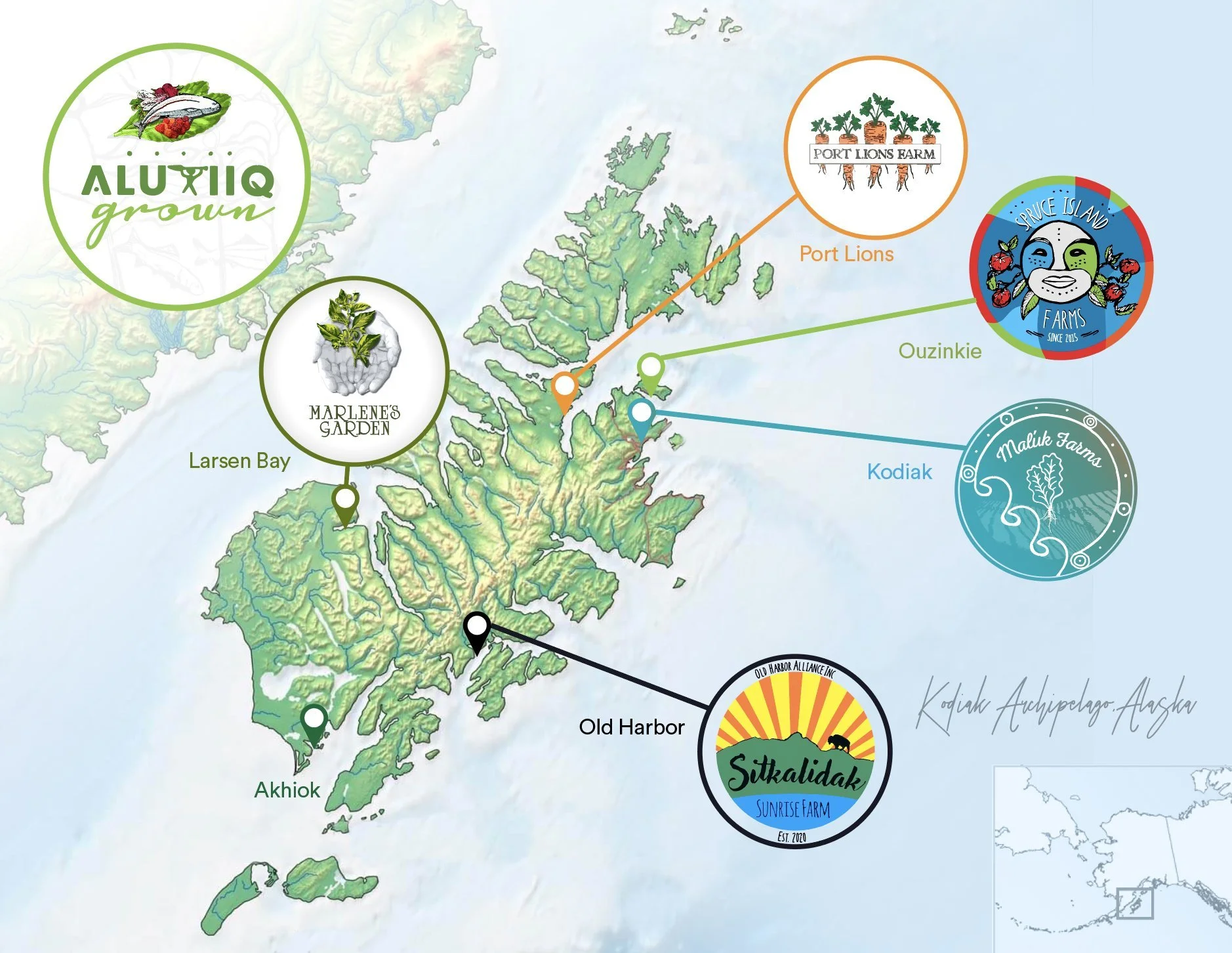 One project we are proud of is our ongoing work with the Kodiak Archipelago Leadership Institute (KALI) in supporting small farm development in communities in that region. The Alutiiq Grown producers are growing, harvesting, and distributing fresh and healthy foods for their tribal and community members. This work is important in creating and expanding food security and sovereignty for Kodiak. Check out the latest work being done on the Alutiiq Grown Farms, their hydroponic projects, the Qik'rtaq Foodhub, and their mariculture projects! Look for the "Alutiiq Grown" brand when shopping!